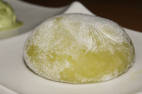 The Mochi Green Tea Ice Cream is the same green tea ice cream described above but it is wrapped in mochi. Mochi is sweet Japanese rice cake. The wrapping gives the dish a slight chewy exterior and adds a little extra sweet, but soft, flavoring. -