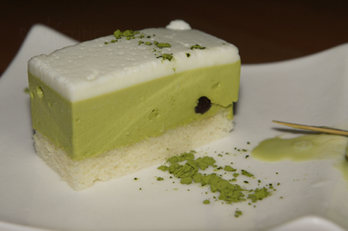 The Green Tea Mochi Mousse is layers of Green Tea Mousse and Mochi. It is very light and airy. Mousse is typically made from eggs and cream and incorporates air bubbles in its preparation to render it airy and light. A good, fluffy dessert that is not overly rich.