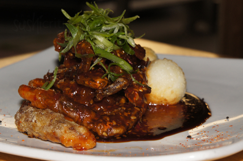 The next dish is Red Dragon Soft Shell Crab. It is fried soft shell crab with a spicy red dragon sauce and a sprinkling of scallions and sesame seeds. The crabs are served with toasted rice cakes. Little fun fact about soft shell crabs. They shed their shells as a reaction to the full moon, rendering themselves as soft shell crabs once a month. Some places utilize special lamps to give the effect of a full moon, forcing crabs to go through this process. However these crabs are harvested locally. The red dragon sauce has a nice heat and a smokiness. The crab has a nice crunch to it. The dish is a little heavy and the sauce is very flavorful, but on the rich side so it could have used a little less. -