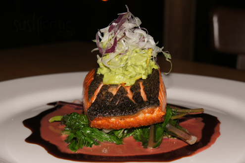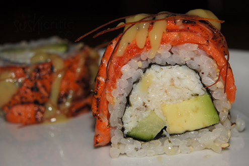 The Torched Salmon is a California roll (crab, avocado and cucumber) inside with torched salmon on top. It is then drizzled with a misto mustard sauce. The roll is soft and smoky and the salmon is very bursting with flavor. The crab in the California roll is fresh and light, not imitation.