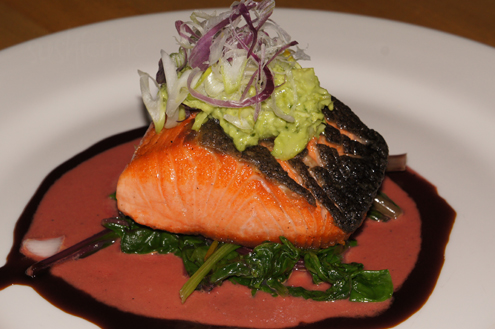 We are brought a filet of Alaskan Wild King Salmon. We are informed that the salmon was flown in fresh from Alaska that morning. It is served in a red pepper vinaigrette with garlic pesto and purple scallions. The fish is placed on top of a rainbow slaw. The dish is a beautiful mix of colors and flavors. The thick fish is perfectly cooked with a crisp outside. The pesto is robust, the vinaigrette is light and the slaw is crispy and appetizing. They put a lot of thought into their dishes and it shows. This is a special offered that evening and it is absolutely delectable. -